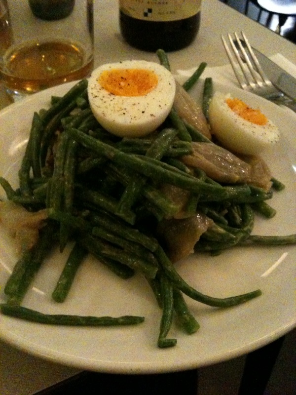 I take two inputs, one slice of bread with sheep's brain and another with green beans, shallots and boiled eggs. All with a small beer a little bitter. So the brains of sheep, was a first for me, and it was fabulous. They put just the right seasoning, the bread was crisp and hot, and so the brain melting! I tasted at the same time the green beans, which also crunched between the teeth, the egg was perfectly cooked, the limit of the calf ... And I must speak my melting shallots and wonderful! And everything went very well together, the freshness, taste and crunch / flux.